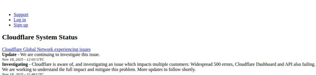 A Cloudflare hivatalos státuszjelzései (már amikor elérhetőek) „belső szolgáltatásromlásról” beszélnek. A cég elismerte, hogy szokatlan forgalmi tüskét észleltek (UTC idő szerint 11:20 körül), ami miatt a hálózatukon átmenő forgalom jelentős része hibákba ütközik.